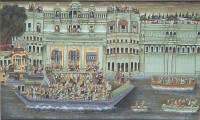 ¿ì´ÙÀÌǪ¸£(È£¼öÀÇ µµ½Ã)ÀÇ ±Ã±È¿¡¼ ¿ÕÀÌ »çÀý´ÜÀ» Á¢°ßÇϰí ÀÖ´Â Àå¸éÀÌ´Ù. ³ª¹« ¾Æ·¡ Á¤ÀÚ¿¡¼ ÀÌ·ç¾îÁö°í ÀÖ´Â Á¢°ß Àå¸éÀ» º¸±â À§ÇØ ¿Õ±ÃÀÇ ¿Á»ó°ú º£¶õ´Ù¿¡ ¸¹Àº »ç¶÷µéÀÌ ¸ð¿© ÀÖ´Â °ÍÀÌ º¸ÀδÙ. ÇÑÆí¿¡¼± ¾Ç»çµéÀÇ ¿¬ÁÖ¿¡ ¸ÂÃç ¿©ÀεéÀÌ ÃãÀ» Ãß°í ÀÖ´Ù. Àεµ¿¡¼± ¾î¶² Çà»çµç À½¾Ç°ú ÃãÀÌ ²À µîÀåÇÑ´Ù.